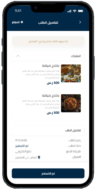 بعد تجهيز الطلب، يستلمه المندوب ويوصله مباشرة إلى باب منزلك.